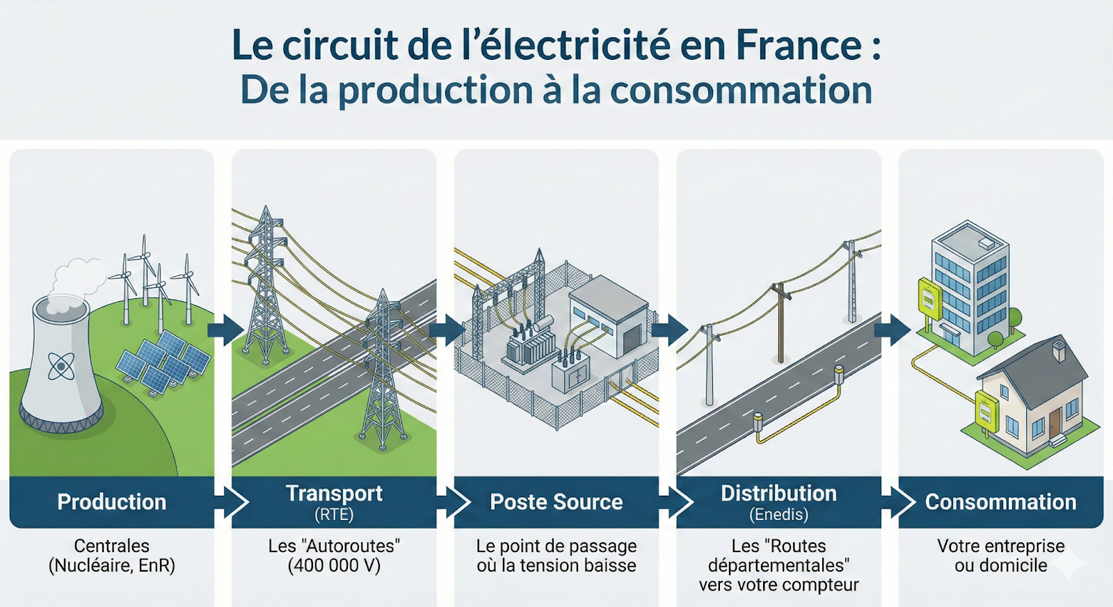Le courant traverse plusieurs étapes : il est généré par les centrales, circule sur les lignes de RTE, passe par un poste source pour baisser en tension, puis est pris en charge par Enedis qui l'apporte jusqu'à votre compteur. Les fournisseurs d'énergie ont ensuite recours à Enedis pour satisfaire les besoins finaux de leurs clients.